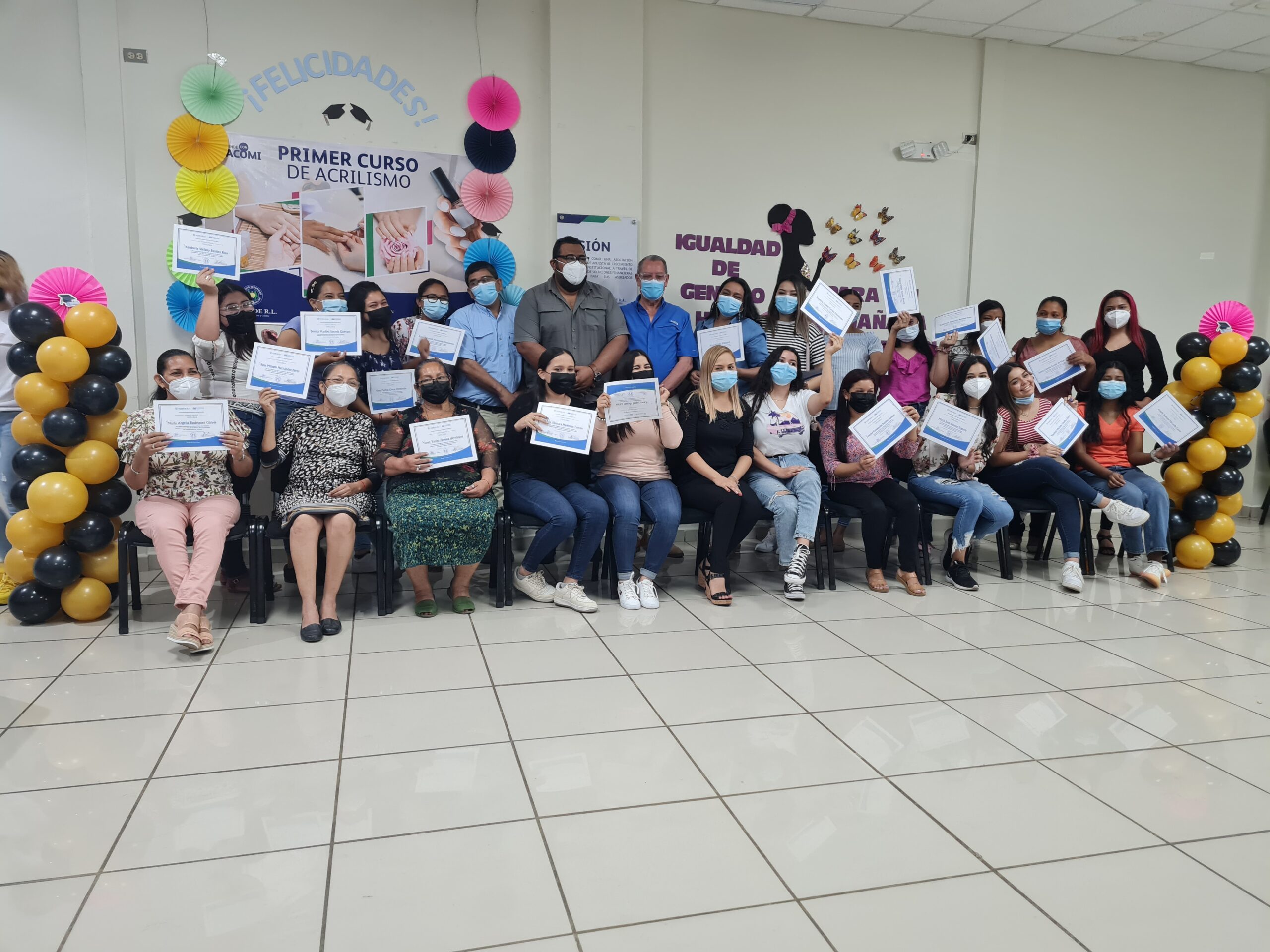 Son 29 mujeres que recibieron su diploma en el primer curso de acrilismo profesional que impartió Acomi de R.L a las asociadas de esta cooperativa, con esto se busca generarle más oportunidades a la mujer.
