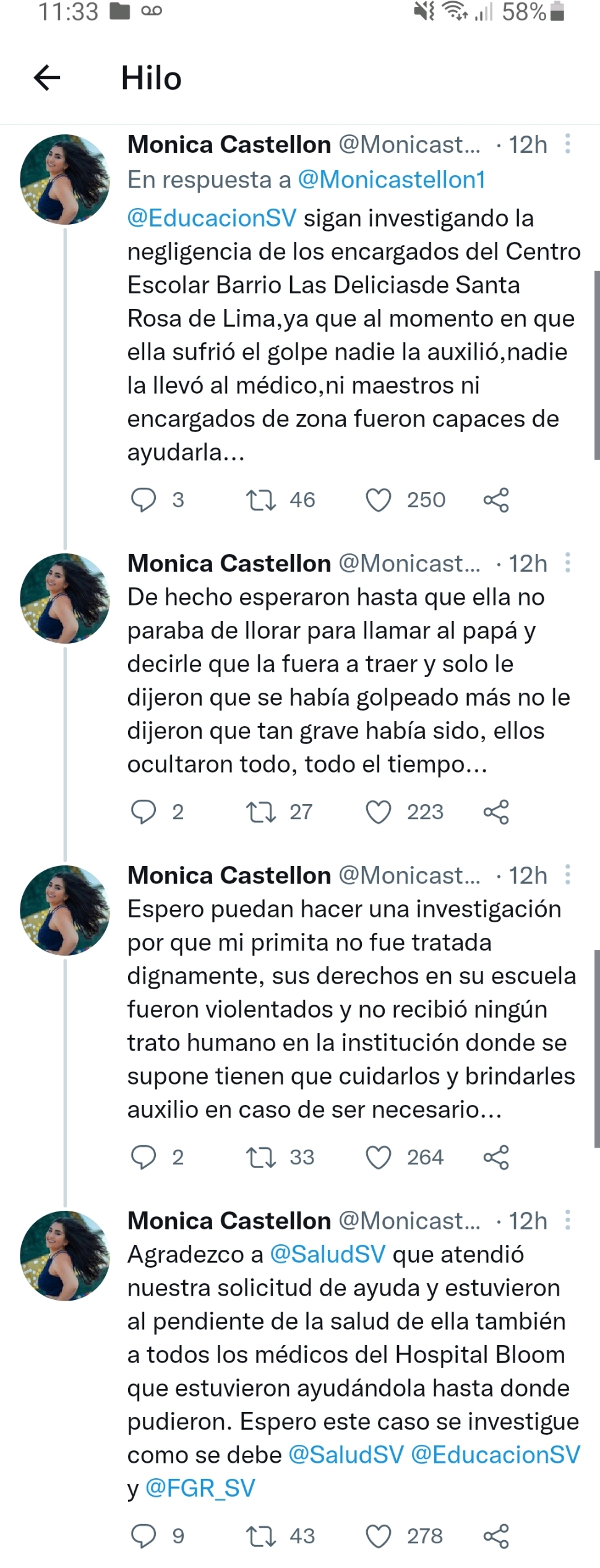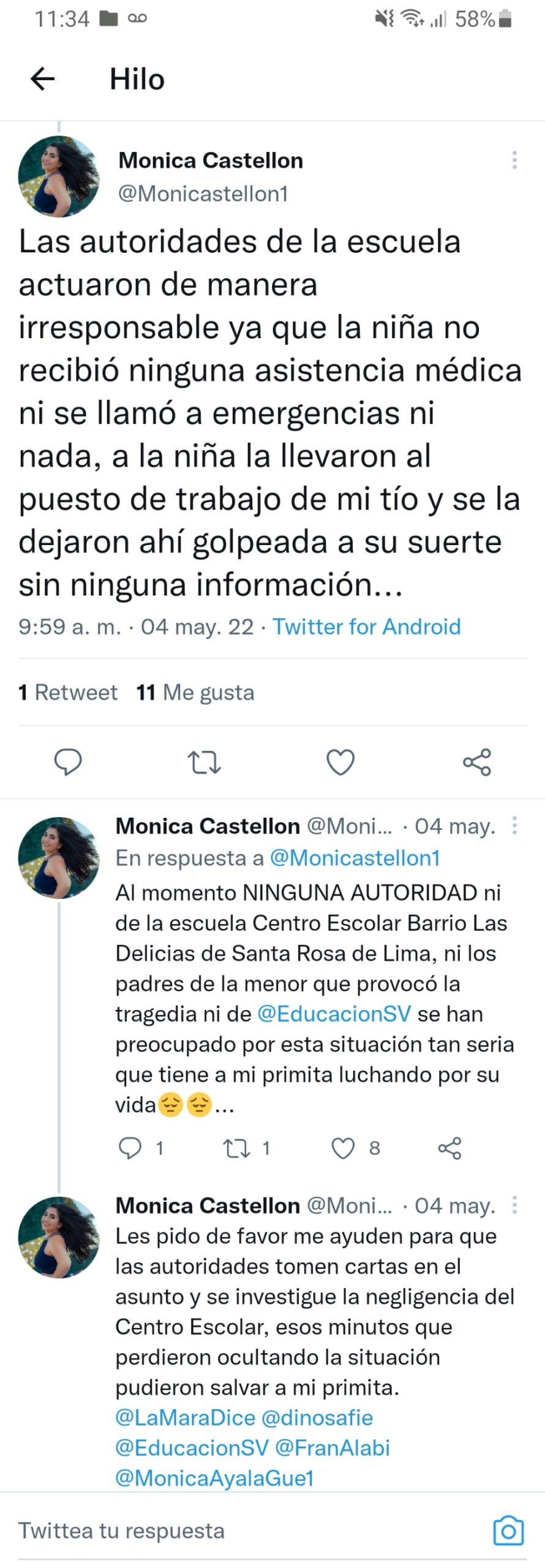 Monica Castellón prima de la menor denunció en redes sociales que nadie auxilió a la menor “nadie la llevó al médico, ni maestros, encargados, fueron capaces de ayudarla”.