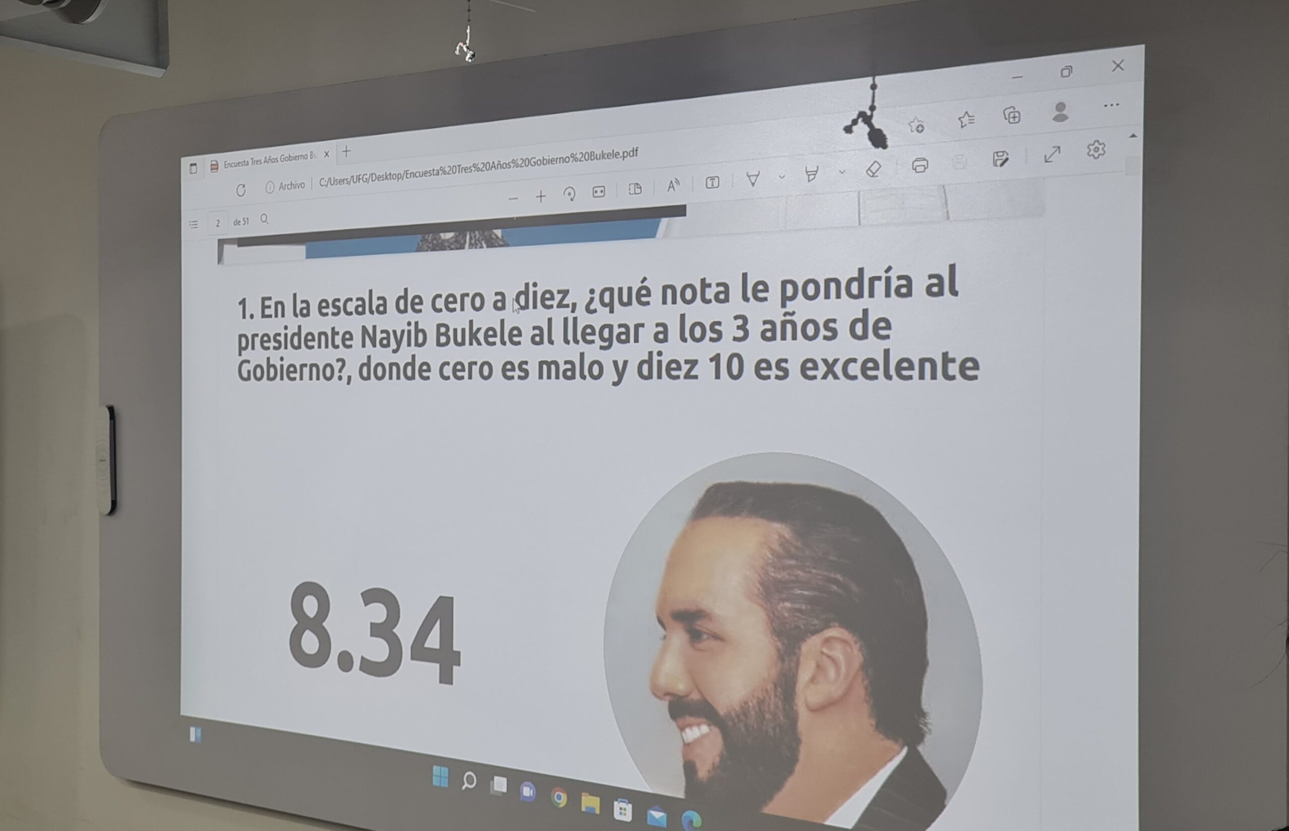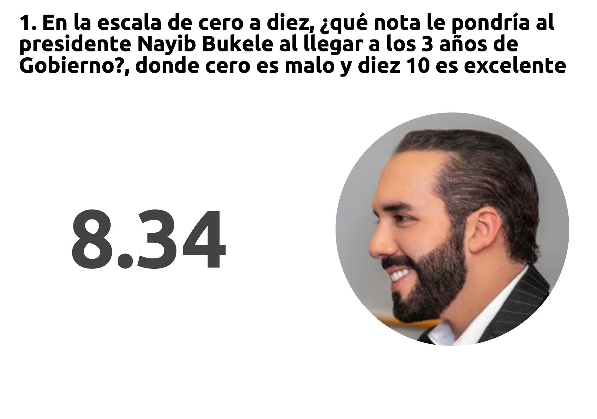 8.34 es la calificación que le asigna la ciudadanía según el más reciente informe del Centro de Estudios Ciudadanos de la UFG, el cual también destaca que un 72% de la población apoya su reelección presidencial.