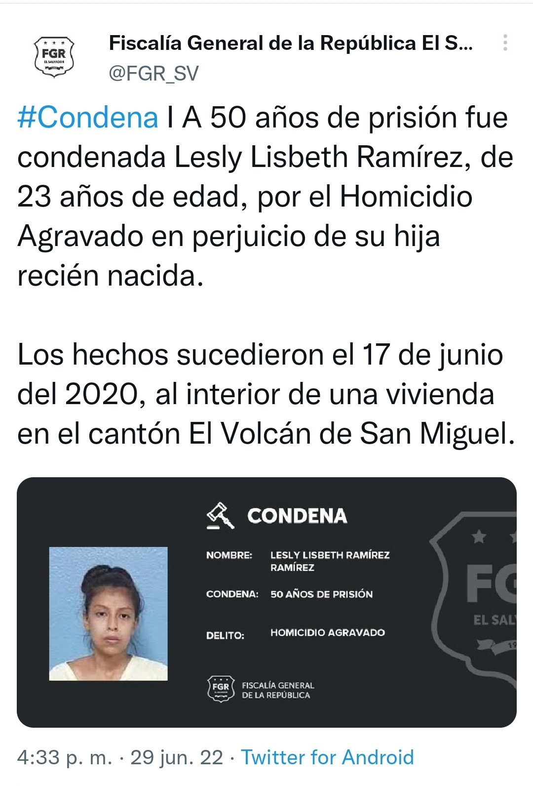 La Fiscalía General de la República informó que condenaron a 50 años de prisión a Lesly Lisbeth Ramírez Ramírez, de 23 años, acusada de homicidio agravado en perjuicio de su hija recién nacida.