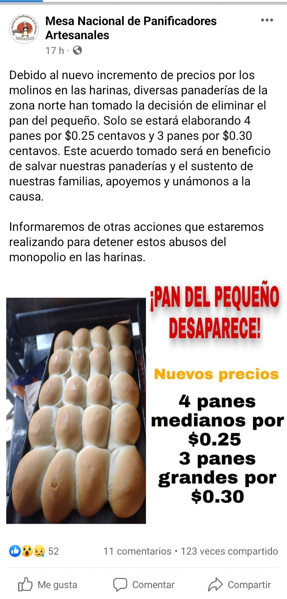 “Solo se estará elaborando 4 panes por $0.25 centavos y 3 panes por $0.30 centavos. Este acuerdo tomado será en beneficio de salvar nuestras panaderías y el sustento de nuestras familias, apoyemos y unámonos a la causa”. Dijeron a través de Facebook.